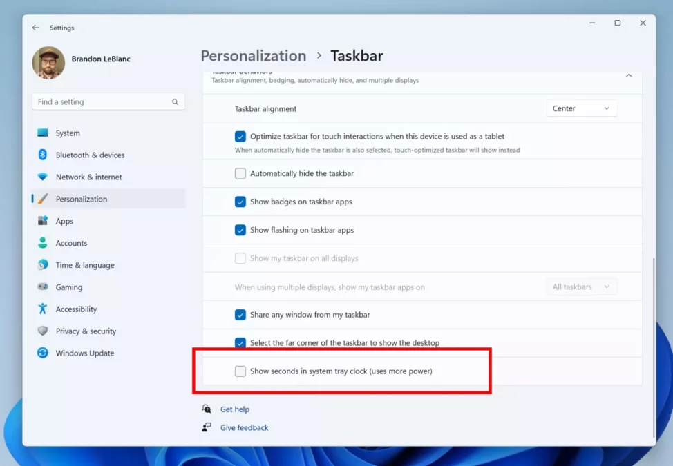 Με τα Windows 11Κατασκευάστε 23419Στο κανάλι DEV, η Microsoft έφερε πολλά νέα χαρακτηριστικά, συμπεριλαμβανομένης της εισαγωγής της δυνατότητας να δείχνει δευτερόλεπτα στο ρολόι στο δίσκο του συστήματος. Η λειτουργία μπορεί να ενεργοποιηθεί μέσωΡυθμίσεις>Εξατομίκευση>Γραμμή εργασιώνστοΣυμπεριφορά της γραμμής εργασιώντμήμα. Αξίζει να σημειωθεί ότι αυτή η λειτουργία θα καταναλώνει περισσότερη ισχύ.