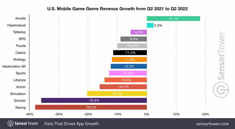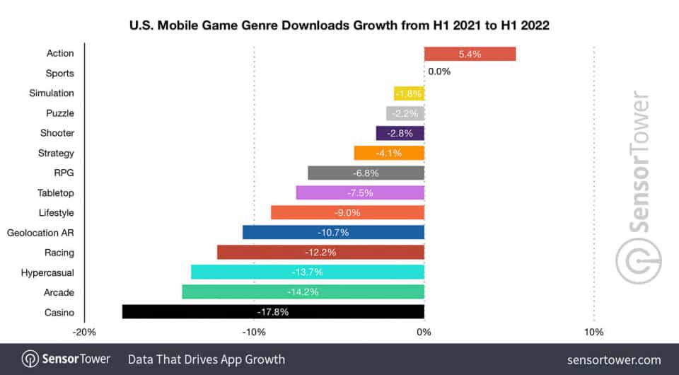 Σύμφωνα με τα στοιχεία που συλλέχθηκαν απόΠύργος αισθητήρα, η αγορά κινητών παιχνιδιών μειώθηκε κατά 9,6 % σε ετήσια βάση σε 11,4 δισεκατομμύρια δολάρια. Η εταιρεία ανέλυσε 14 κύρια είδη παιχνιδιών στο H1, 2022 σε σύγκριση με το H1, 2021, εξετάζοντας τα έσοδα και τις λήψεις σε κάθε κατηγορία σε ολόκληρο το App Store και το Google Play.