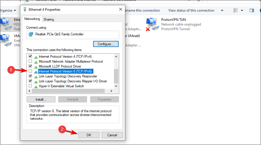 - ΕγκατάστασηΈκδοση πρωτοκόλλου Internet 6 (TCP/IPv6)και καταργήστε το. Τώρα κάντε κλικ στο OK.