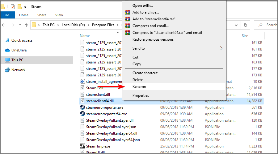 C:Program FilesSteam - ΕγκατάστασηSteamClient64.dll, κάντε δεξί κλικ και επιλέξτε μετονομασία.