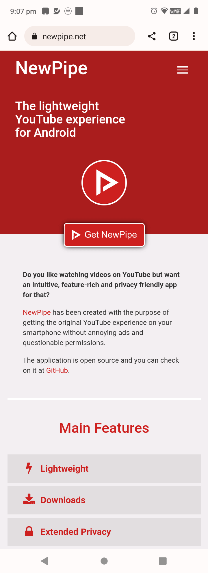 - Κατευθυνθείτε προς τοεπίσημος ιστότοποςΓια να κατεβάσετε το NewPipe. Πατήστε τοΠαίρνω νέακουμπί για να πλοηγηθείτε στη σελίδα λήψης.
