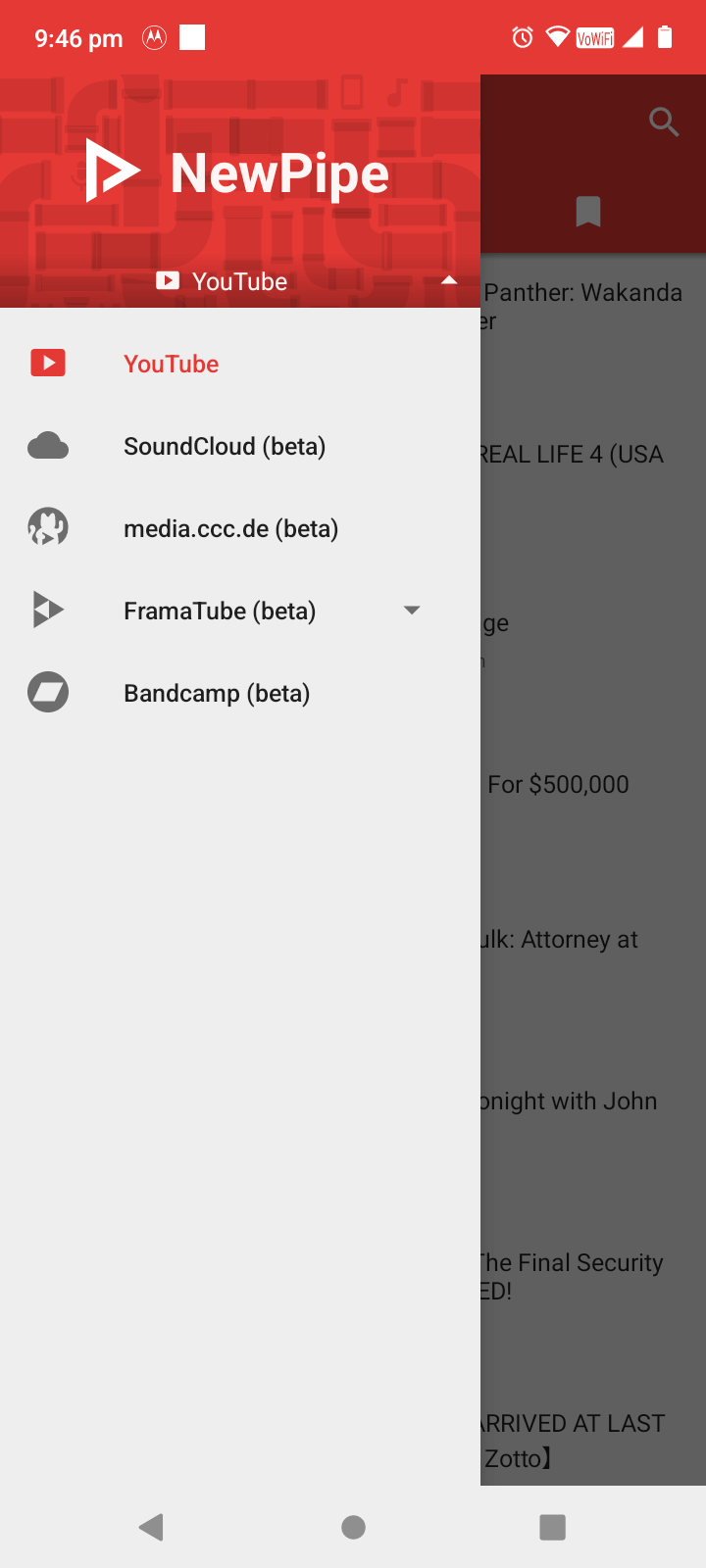 Για να μεταβείτε σε άλλη υπηρεσία, κατεβάστε το μενού Hamburger και, στη συνέχεια, πατήστε το βέλος δίπλα στο YouTube. Τώρα μπορείτε να επιλέξετε οποιαδήποτε από τις πλατφόρμες που υποστηρίζονται από το Newpipe.