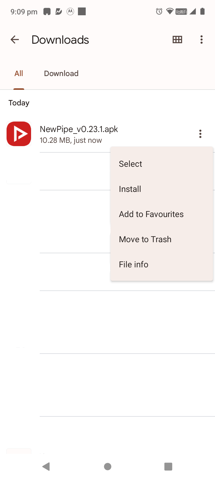 - Μεταβείτε στον κατάλογο που περιέχει το Newpipe APK (συνήθως το φάκελο λήψεων) και πατήστε τα τρία σημεία με το όνομά του. ΕπιλέγωΕγκαθιστώ.