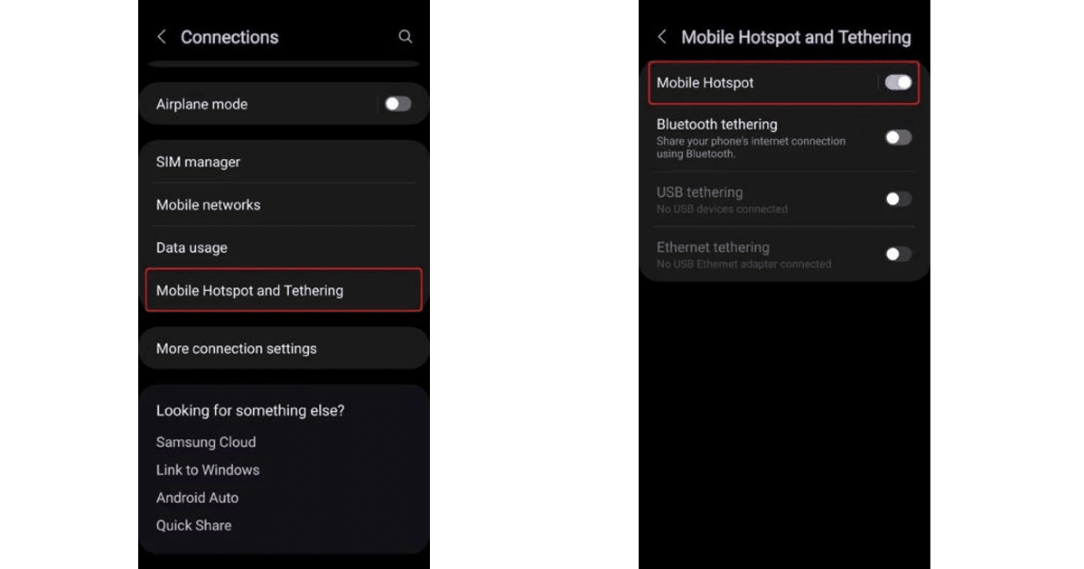 - Ενεργοποιήστε τη λειτουργία: μεταβείτε στοΡυθμίσεις>Συνδέσεις>Κινητό hotspotκαιΠρόσδεση>Κινητό hotspot.