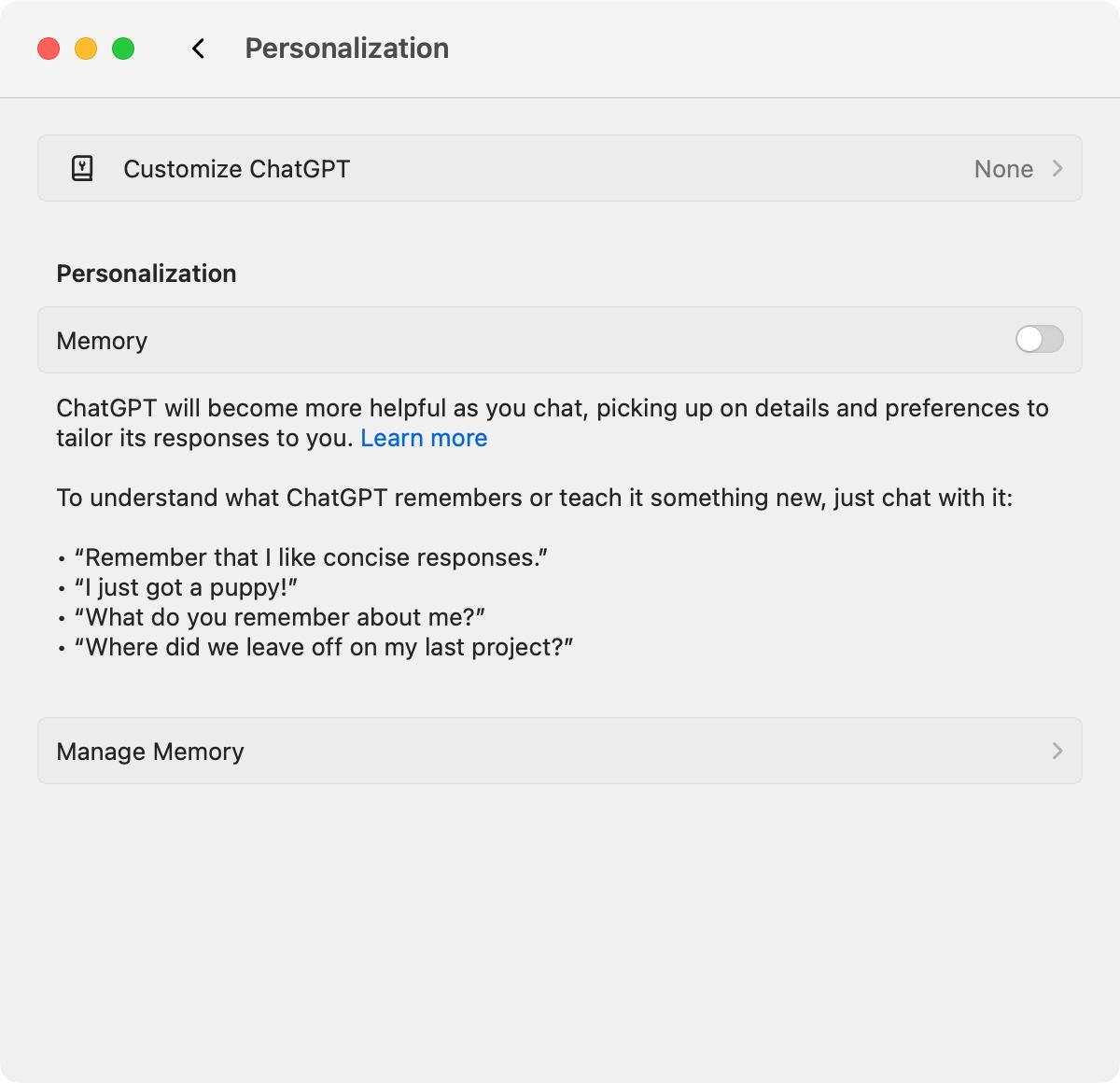 Η εφαρμογή του ChatGpt μπορεί να θυμηθεί τις συνομιλίες σας, να μάθετε από αυτήν και να χρησιμοποιήσετε τα δεδομένα για να προσαρμόσετε τις απαντήσεις σας σε εσάς. Αυτή η λειτουργία ονομάζεται μνήμη, δεν είναι ενεργοποιημένη από προεπιλογή.