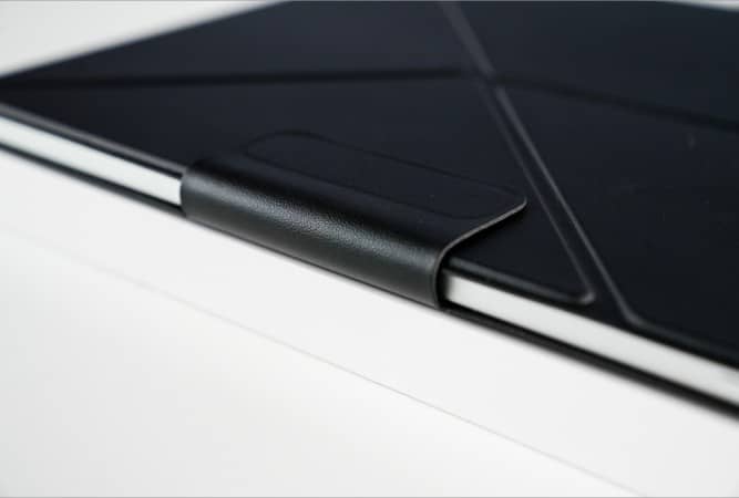 Επιπλέον, το προϊόν έχει ένα μικροσκοπικό κρυμμένο μαγνητικό λουρί στο πλάι. Με μια σταθερή λαβή, ο μικρός ιμάντας σκαρφαλώνει το μολύβι μήλων κοντά στο δισκίο. Εάν δεν θέλετε ο ιμάντας να κολλήσει, μπορείτε να το αναστρέψετε προς τα μέσα έτσι ώστε να κολλήσει στο φύλλο μέσω μαγνήτη.