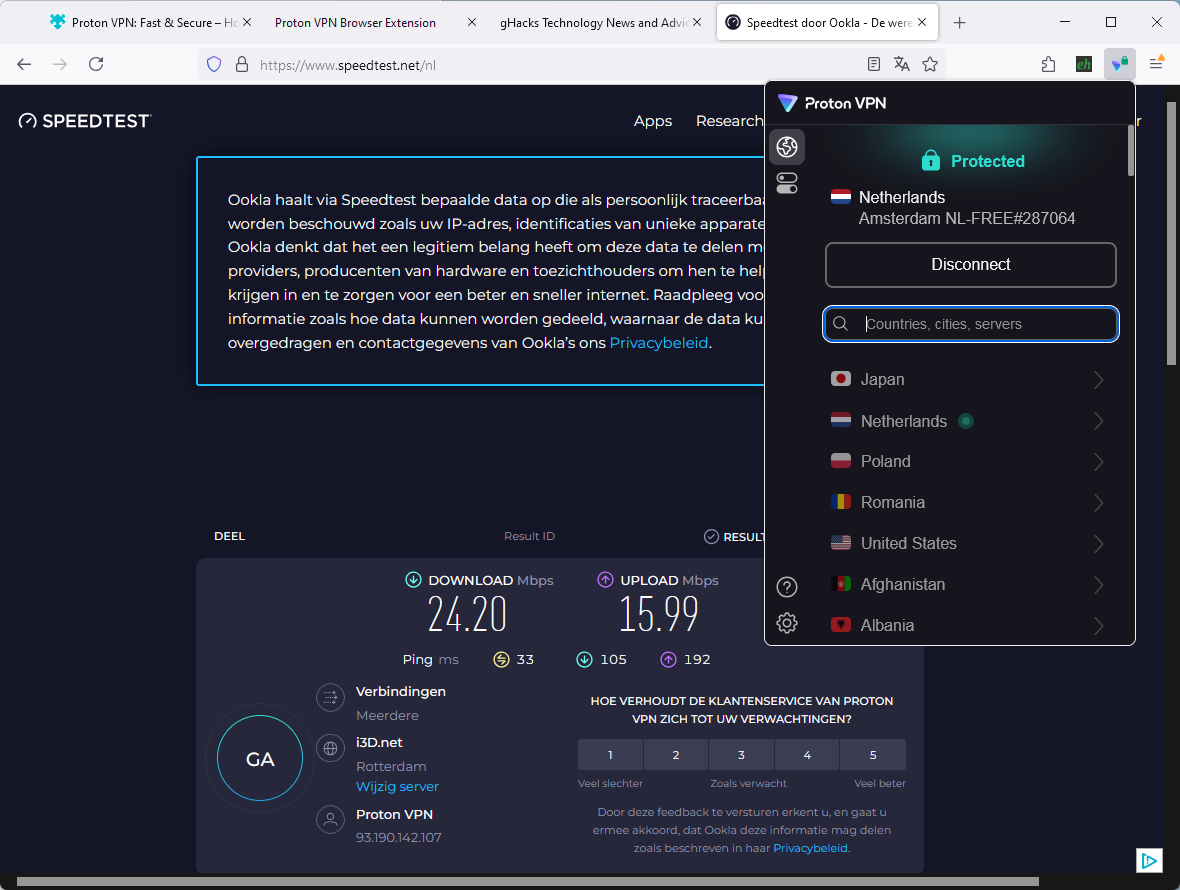 Αποτελέσματα δοκιμών ταχύτητας της επέκτασης του προγράμματος περιήγησης VPNS Proton VPNS