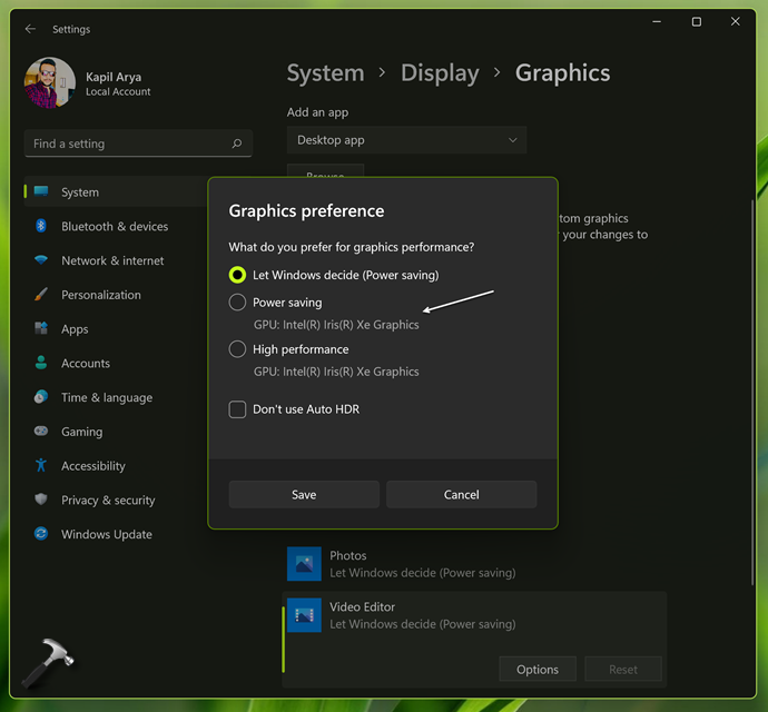 Εάν θέλετε να συμπεριφέρετε τις εφαρμογές σας διαφορετικές σε σχέση με τα γραφικά, μπορείτε να ορίσετε προτιμήσεις γραφικών για εφαρμογές. Τα Windows 11 διαθέτουν τις διαθέσιμες ρυθμίσεις, ώστε να μπορείτε να τα διαμορφώσετε για ορισμένες εφαρμογές της επιλογής σας. Χρησιμοποιώντας αυτές τις ρυθμίσεις, μπορείτε επίσης να ορίσετε την επιθυμητή GPU, σε περίπτωση που έχετε συνδεθεί περισσότερα από ένα GPU. Μπορείτε να καθορίσετε μεμονωμένα την GPU για εφαρμογές Microsoft Store και εφαρμογές επιφάνειας εργασίας.