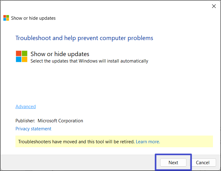 1. Πρώτον,Κατεβάστε την εκπομπή ή αποκρύψτε τις ενημερώσεις προβλημάτωνΠακέτο (αρχείο wushowhide.diagcab) από τη σελίδα Microsoft.