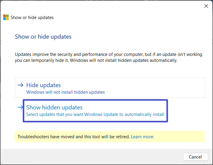 Απόκρυψη ενημερώσεων χρησιμοποιώντας το αντιμετωπίζει αντιμετώπιση προβλημάτων