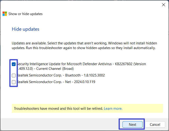 5. Στη συνέχεια, επιλέξτε τις ενημερώσεις που θέλετε να αποκρύψετε ή να μπλοκάρετε και κάντε κλικ στο κουμπί "Επόμενος«.
