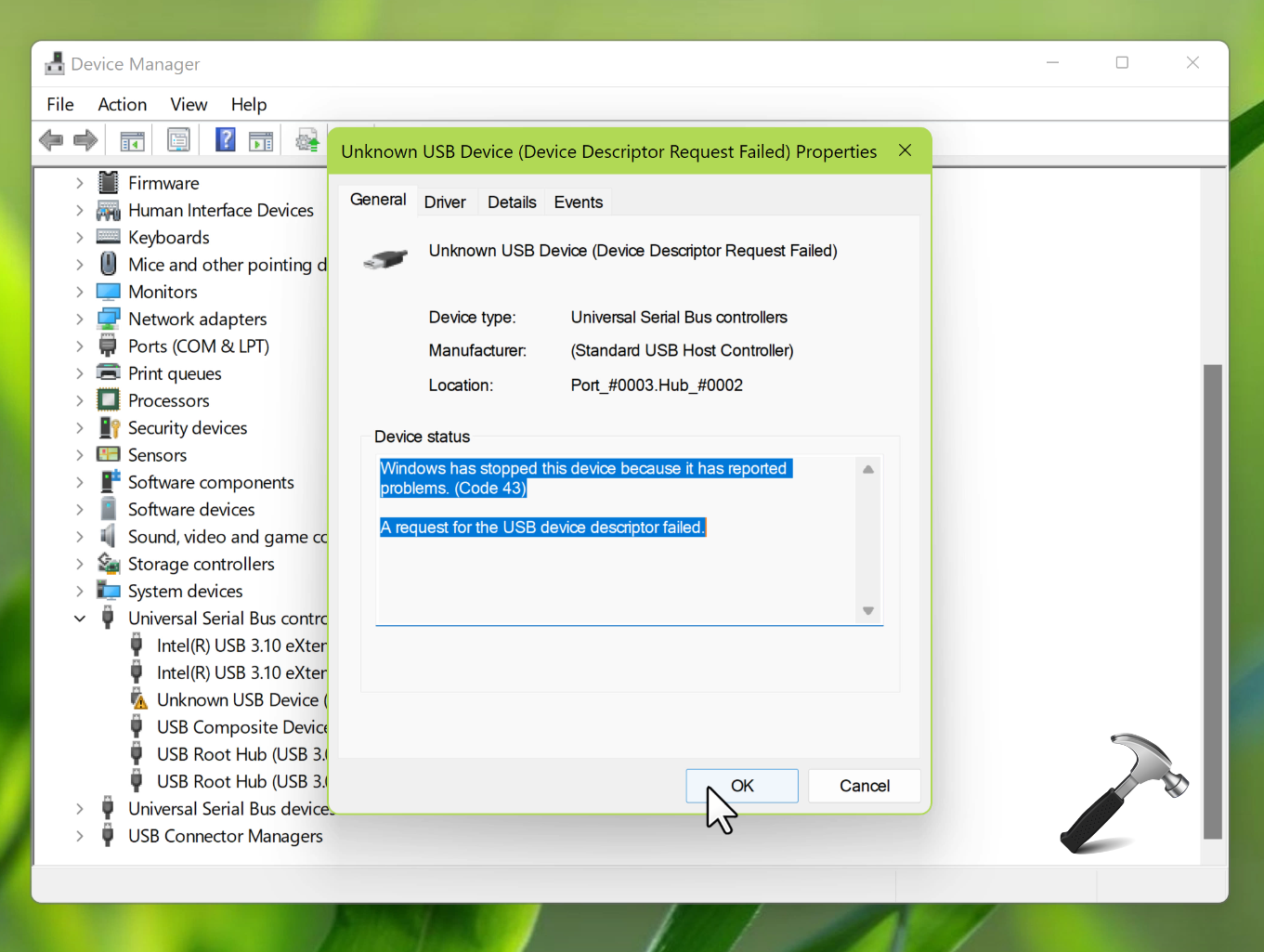 Επιπλέον, εάν κάντε διπλό κλικ στη συσκευή στην καρτέλα Γενικά του φύλλου ιδιοκτησίας, μπορείτε να εντοπίσετε τον κωδικό σφάλματος 43.