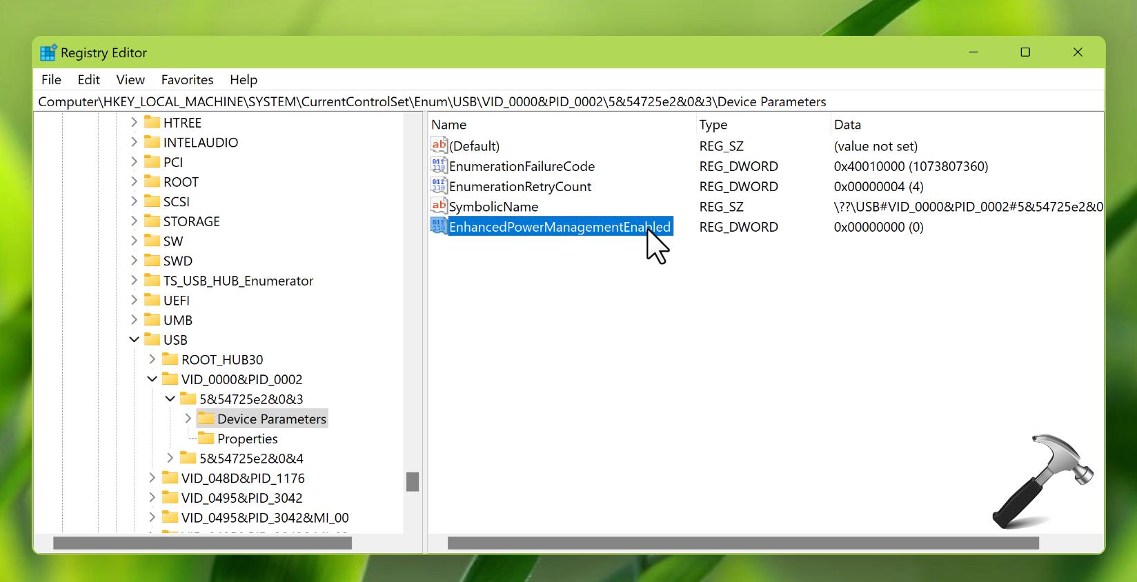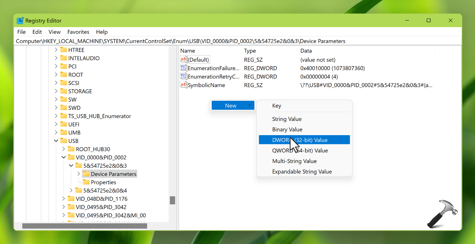 5.ΠηγαίνωHKEY_LOCAL_MACHINESYSTEMCurrentControlSetEnum. Μόλις φτάσετε στο κλειδί μητρώου Enum, επικολλήστε τη διαδρομή στιγμιότυπου της συσκευής που αντιγράφηκε από το βήμα 3 και πατήστε το πλήκτρο Enter. Τότε πηγαίνετε στοΠαράμετροι συσκευήςΥπο-κλειδί μητρώου.