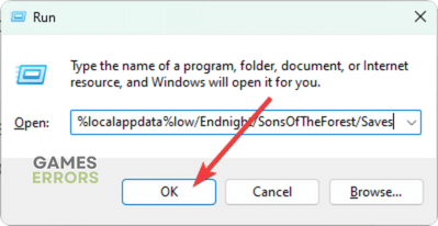 - Τύπος%localappdata%χαμηλό/endnight/sonsoftheforest/savesκαι κάντε κλικ στο κουμπίΕΝΤΑΞΕΙ.