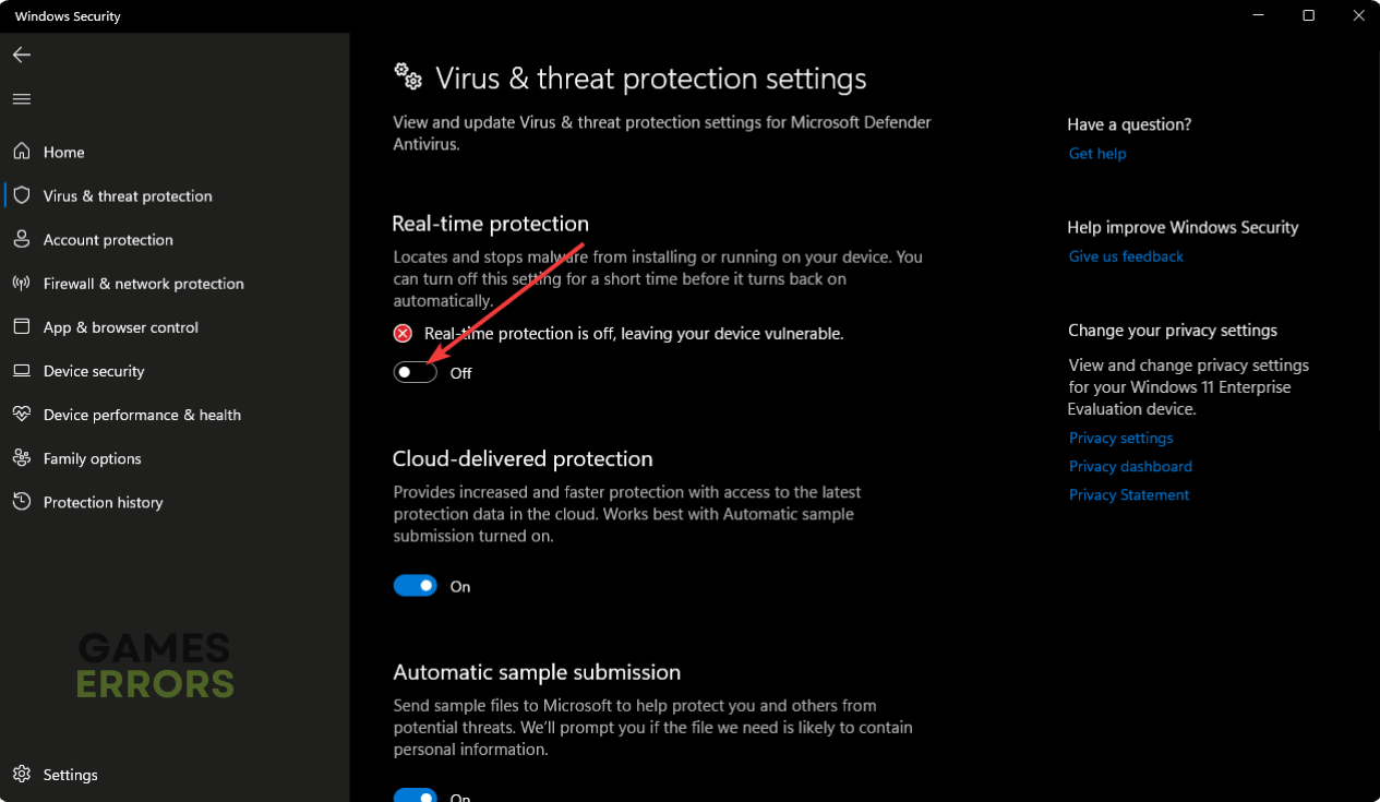 - Επίσης, απενεργοποιήστεΠροστασία σε πραγματικό χρόνοΕάν τα προηγούμενα βήματα δεν βοηθήσουν.