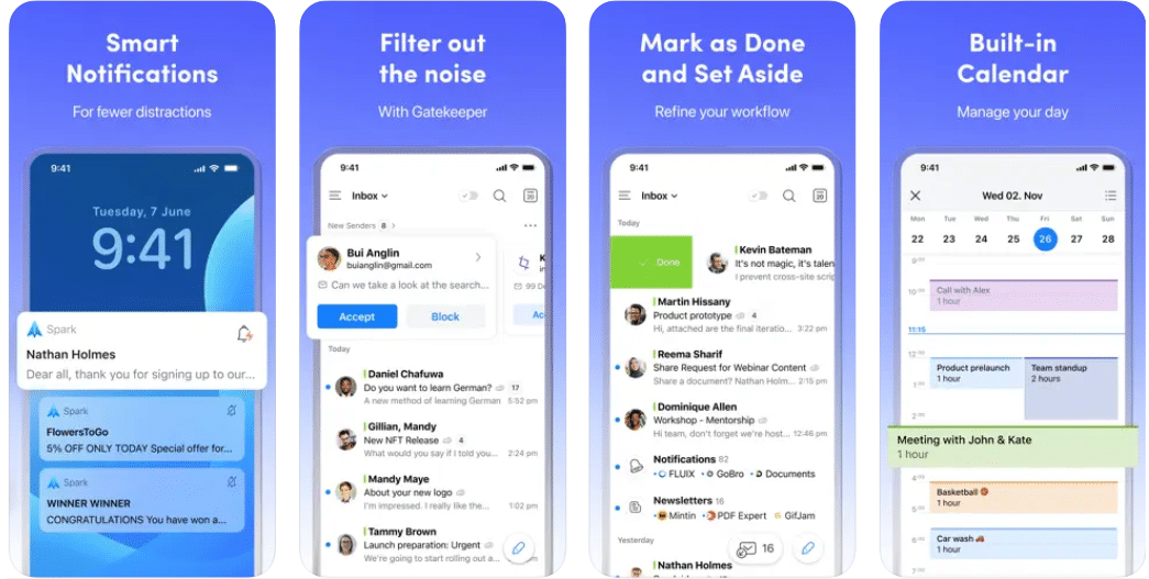 Το Spark αγκαλιάζει μια σύγχρονη προσέγγιση με χαρακτηριστικά όπως τα μηνύματα που αναβάλλουν, τη ρύθμιση υπενθυμίσεων και τον προγραμματισμό μηνυμάτων ηλεκτρονικού ταχυδρομείου. Δίνει έξυπνα προτεραιότητα σε μηνύματα από γνήσιες επαφές ενώ φιλτράρει τις ειδοποιήσεις από εφαρμογές και ενημερωτικά δελτία. Η συνάρτηση ηλεκτρονικού ταχυδρομείου προτεραιότητας υπογραμμίζει σημαντικούς αποστολείς και καρφίτσες κρίσιμα μηνύματα, ενώ οι σημαίες του Gatekeeper σημαίνουν άγνωστα μηνύματα ηλεκτρονικού ταχυδρομείου, που σας ζητούν να τα αποδεχτείτε ή να τα απορρίψετε. Οι ειδοποιήσεις για αυτό μπορούν να προσαρμοστούν στις ρυθμίσεις.