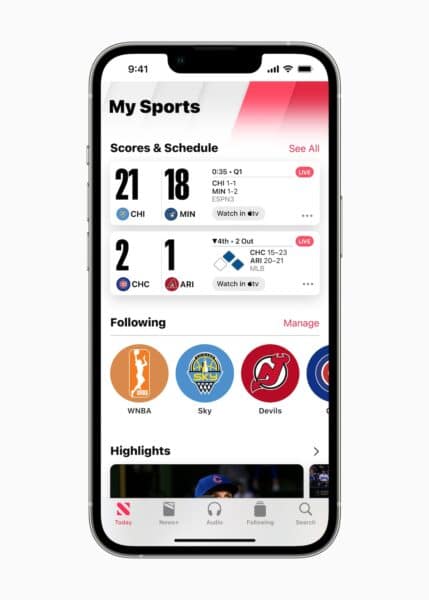 Η Apple έχει επίσης προσθέσει μια νέα κατηγορία αθλητικών στην Apple News, η οποία θα εμφανίζει βαθμολογίες, χρονοδιαγράμματα και πίνακες πρωταθλήματος τόσο για κολέγια όσο και για επαγγελματικά αθλήματα. Πληροφορίες σχετικά με τις αγαπημένες ομάδες και τα πρωταθλήματα ενός χρήστη θα συγχρονιστούν σε όλες τις συσκευές για να επιτρέψουν τις ειδοποιήσεις "ζωντανής δραστηριότητας".