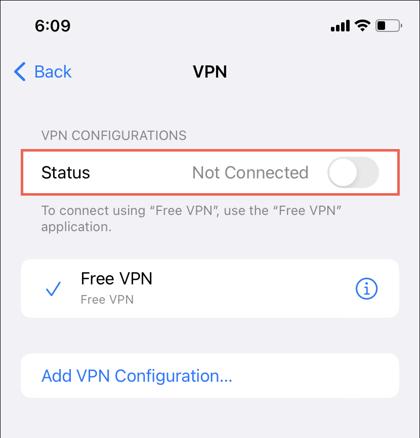 ΠηγαίνωΡυθμίσεις>Γενικός>Διαχείριση VPN & Device(iOS) ήΡυθμίσεις>Δίκτυο & Διαδίκτυο>VPN(Android) και απενεργοποιήστε τυχόν διαμορφώσεις VPN στην κινητή συσκευή σας
