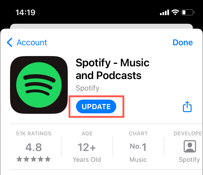 Χρησιμοποιώντας μια ξεπερασμένη έκδοση του Spotify στο Android ή το iPhone σας μπορεί να προκαλέσει απροσδόκητα προβλήματα αναπαραγωγής ήχου, οπότε δοκιμάστε να ενημερώσετε την εφαρμογή στην τελευταία έκδοση. Για να το κάνετε αυτό, επισκεφθείτε το Google Play Store ή το Apple Apple Store, αναζητήστεΣημείωμα, και πατήστεΕκσυγχρονίζωστη σελίδα αποθήκευσης της εφαρμογής.