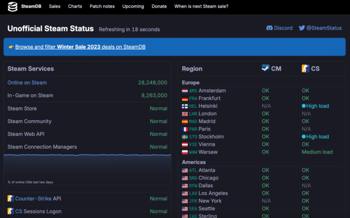 Εάν έχετε απροσδόκητα προβλήματα με το Steam, θα μπορούσε να οφείλεται σε σφάλμα που σχετίζεται με το διακομιστή. Οι διακομιστές ατμού ενδέχεται να βιώνουν χρόνο διακοπής ή προσωρινή υπερφόρτωση, προκαλώντας δυσλειτουργία της υπηρεσίας για τους χρήστες. Πριν προχωρήσετε σε άλλες λύσεις, θα πρέπει να ελέγξετε την κατάσταση του διακομιστή του Steamsteamstat.us.