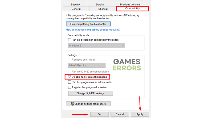 Οι βελτιστοποιήσεις πλήρους οθόνης είναι μια λειτουργία Windows που έχει σχεδιαστεί για να βελτιώσει την εμπειρία παιχνιδιού σας βελτιστοποιώντας το σύστημα για παιχνίδια που εκτελούνται σε πλήρη οθόνη. Ωστόσο, μπορεί να προκαλέσει συντριβές με συγκεκριμένους τίτλους παιχνιδιών, έτσιΣας συμβουλεύουμε να το απενεργοποιήσετε.
