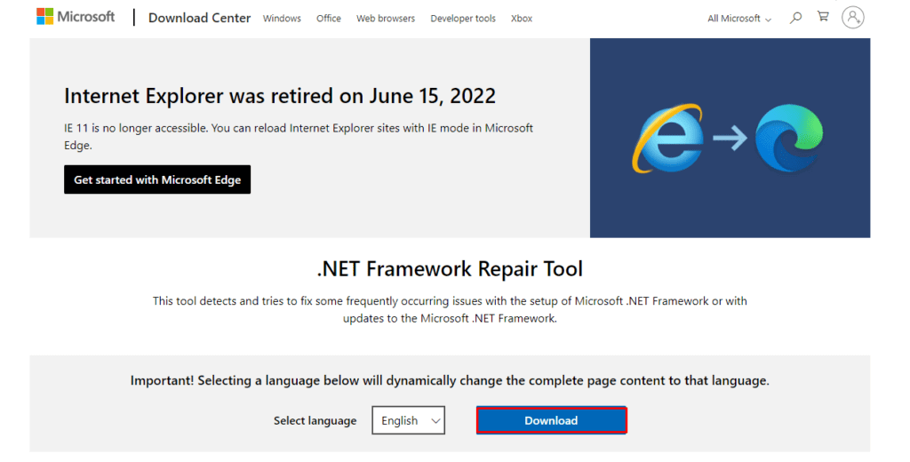 - Πηγαίνετε σε αυτόεπίσημη Microsoftσελίδακαι κατεβάστε το εργαλείο επισκευής πλαισίου .NET.