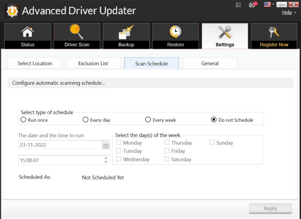Επιπλέον, με το«Πρόγραμμα σάρωσης»μονάδα, προσβάσιμη μέσω του"Ρυθμίσεις"Επιλογή στον πίνακα ελέγχου της εφαρμογής, μπορείτε να προσαρμόσετε ένα εξατομικευμένο πρόγραμμα για την ενημέρωση των προγραμμάτων οδήγησης του υπολογιστή σας. Θα βρείτε ένα ευρύ φάσμα επιλογών για την τελειοποίηση των σαρώσεων του οδηγού σας, επιτρέποντάς σας να προσαρμόσετε τη διαδικασία σύμφωνα με τις συγκεκριμένες ανάγκες σας. Δείτε μόνοι σας -