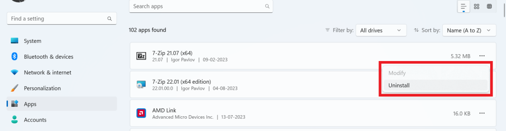 - Μετακινηθείτε προς τα κάτω τη λίστα και απεγκαταστήστε την εφαρμογή που προκαλεί σφάλμα κάνοντας κλικ στο εικονίδιο τριών σημείων ακριβώς μπροστά του.