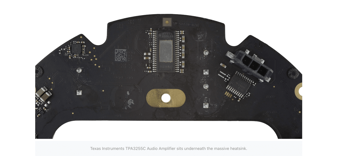 Όπως και το αρχικό HomePod, αυτό χρησιμοποιεί επίσης έναν ενισχυτή κλάσης-D για να οδηγήσει τη συστοιχία ηχείων. Οι ενισχυτές έρχονται σε διαφορετικές κατηγορίες και οι ενισχυτές Class-D είναι σε θέση να εξάγουν υψηλή ισχύς στα ηχεία με καλή απόδοση ενέργειας και χαμηλή παραμόρφωση. Φυσικά, με μεγάλη δύναμη, έρχεται μεγάλες ποσότητες θερμότητας.