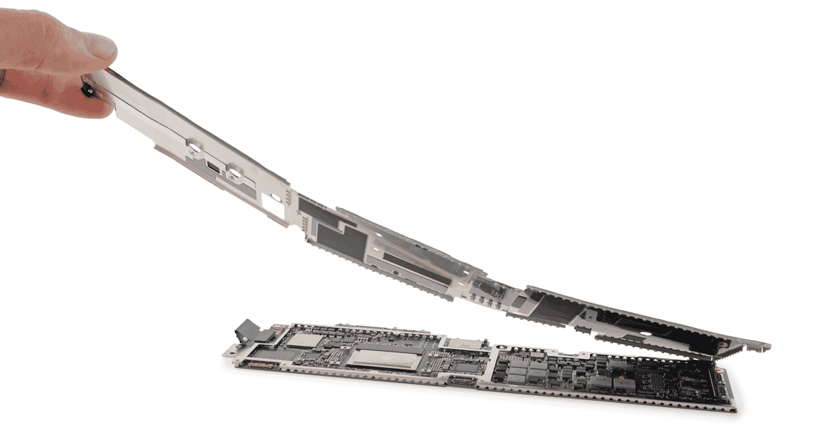 Η μπαταρία είναι ακριβώς κάτω από τη χαμηλότερη θήκη και χρησιμοποιεί ένα μικροσκοπικό σύνδεσμο που μοιάζει με iPhone. Ωστόσο, δεν ήταν τόσο εύκολο να φτάσετε στη λογική πλακέτα, αφού αφαιρέστε πολλαπλές αγκύλες και βιδώνει ο μηχανικός τελικά ήταν σε θέση να απελευθερώσει την ασπίδα κλιπ που χρησιμοποιείται ως προστατευτικό κάλυμμα της λογικής πλακέτας.