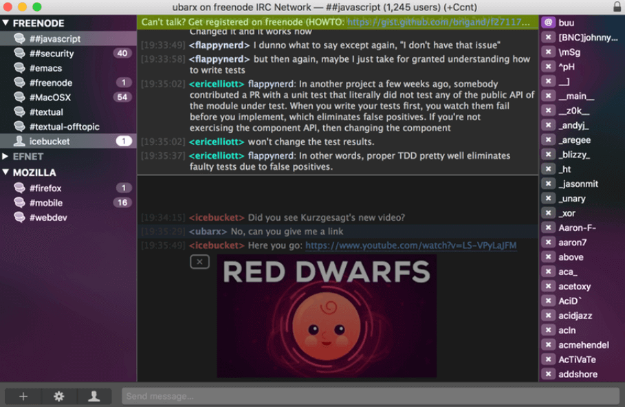 Το LimeChat δεν είναι τόσο πανέμορφο όσο το κείμενο, αλλά η απόδοση και η λειτουργικότητα είναι εκεί. Μπορεί να στείλει ειδοποιήσεις συνομιλίας σε κάθε κανάλι στο οποίο συνδέεστε. Υποστηρίζει συντομεύσεις πληκτρολογίου για εύκολη πλοήγηση και μπορεί να παραμείνει ενεργή στο παρασκήνιο.