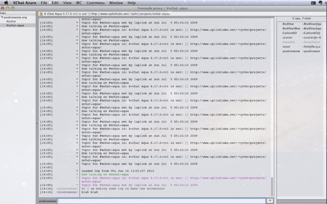 Το Xchat Aqua/Azure είναι ένας ελαφρύς πελάτης IRC που αναπτύχθηκε για συστήματα MAC. Μπορεί να είναι αυτόματη πλήρης εντολές, ψευδώνυμα, και σας προστατεύει από γραμματικά σφάλματα με ένα ολοκληρωμένο εργαλείο ελέγχου ορθογραφίας. Επιπλέον, μπορείτε να μεταφέρετε αρχεία σε άλλους χρήστες.