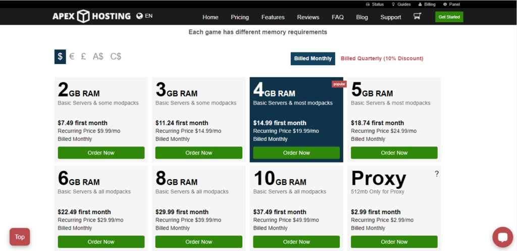 Επιπλέον, αυτή η εταιρεία φιλοξενίας διακομιστή Minecraft διαθέτει ένα εργαλείο συνομιλίας για την υποστήριξη πελατών 24/7. Το Apex Hosting προσφέρει εγκατάσταση με ένα κλικ σε 150 Modpacks, συμπεριλαμβανομένων των SkyFactory, Pixelmon και RLCraft. Εάν έχετε χαμηλό προϋπολογισμό, ξεκινάτε με τον διακομιστή μεσολάβησης 512 MB σε μόλις 2,99 δολάρια το μήνα.