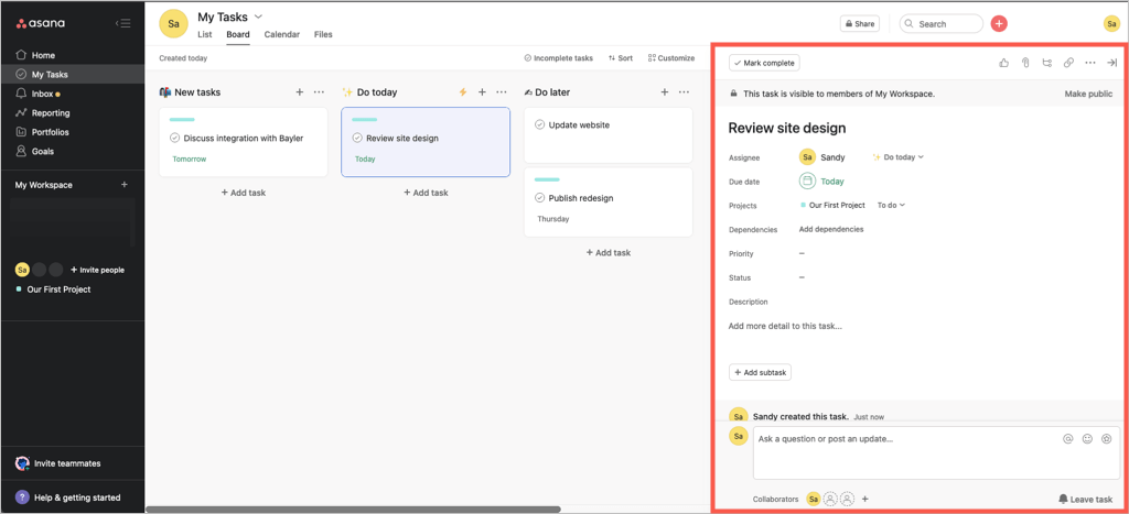 Η Asana είναι μια άλλη καταπληκτική επιλογή για ένα εργαλείο Kanban. Για τα περιβάλλοντα της ομάδας, έχετε ένα τμήμα για να δείτε μόνο τα καθήκοντά σας, να προσθέσετε αγαπημένα και να δείτε τα εισερχόμενά σας για πρόσφατες δραστηριότητες.
