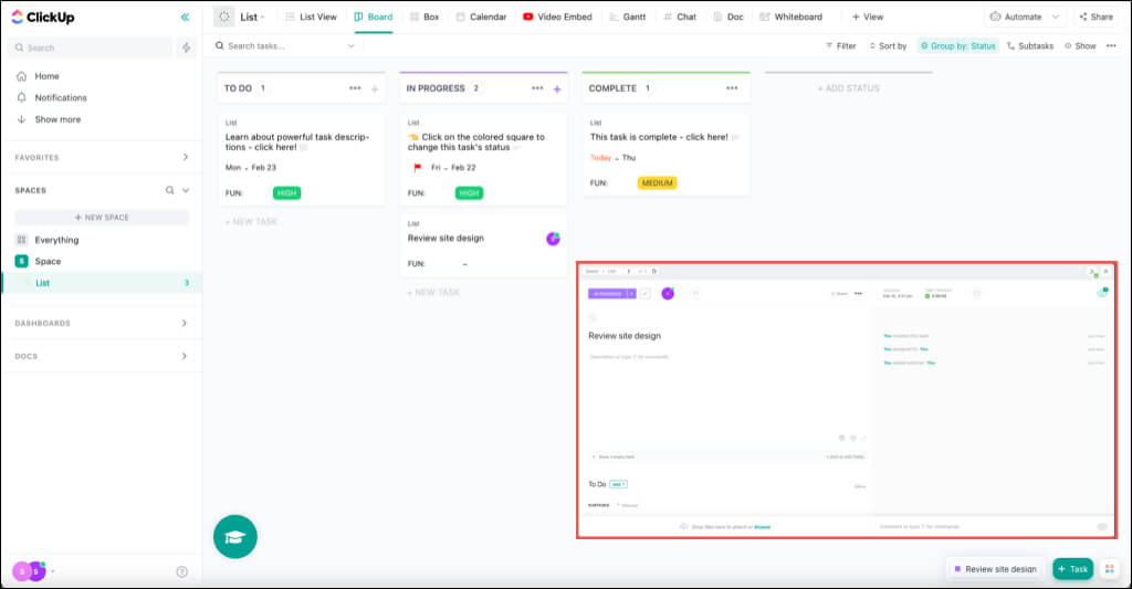 Το ClickUp είναι μια υπηρεσία που προσφέρει πολλά χαρακτηριστικά εκτός από τα πίνακες Kanban. Επωφεληθείτε από τα διαγράμματα Gantt, τους πίνακες ελέγχου, τους χάρτες μυαλού, τις μορφές και τις λίστες υποχρεώσεων.