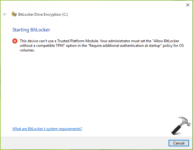Αυτή η συσκευή δεν μπορεί να χρησιμοποιήσει μια αξιόπιστη μονάδα πλατφόρμας. Ο διαχειριστής σας πρέπει να ορίσει την επιλογή "Επιτρέψτε το BitLocker χωρίς συμβατή TPM" στην πολιτική "Απαιτείται πρόσθετος έλεγχος ταυτότητας κατά την εκκίνηση" για όγκους λειτουργικού συστήματος.