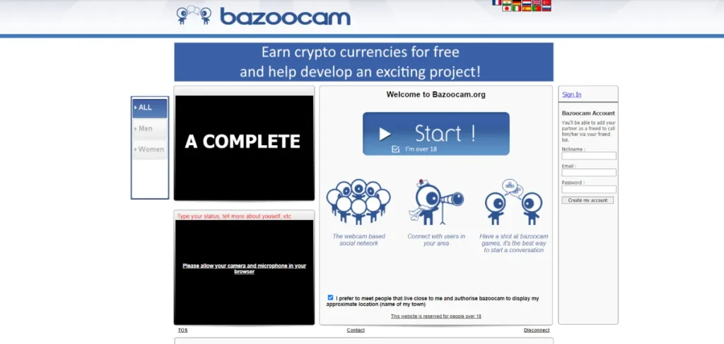 Το Bazoocam είναι ένας ζωντανός ιστότοπος συνομιλίας μέσω βίντεο όπου μπορείτε να συναντήσετε ανθρώπους από όλο τον κόσμο. Μπορείτε να βρείτε ανθρώπους όλων των ηλικιών, εθνικοτήτων και σεξουαλικών προσανατολισμών στο Bazoocam. Ένα άλλο μεγάλο πράγμα για το Bazoocam είναι ότι είναι ένας ελεύθερος ιστότοπος, οπότε δεν χρειάζεται να πληρώσετε για τίποτα. Το Bazoocam είναι επίσης πολύ εύκολο στη χρήση χωρίς περίπλοκη διαδικασία εγγραφής, επειδή το μόνο που χρειάζεται να κάνετε είναι να κάνετε κλικ στο κουμπί Start Now και να συμμετάσχετε στη διασκέδαση.