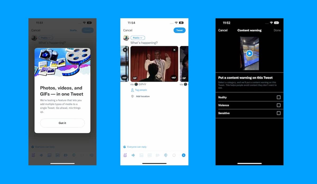 Για να προσφέρει στους χρήστες περισσότερους τρόπους για να εκφραστούν, το Twitter έχει εισαγάγει μικτά μέσα. Τώρα, οι χρήστες μπορούν να δημοσιεύσουν φωτογραφίες, βίντεο και GIFs μαζί σε ένα μόνο tweet για να μοιραστούν περισσότερα για ένα γεγονός, δραστηριότητα ή διαφορετικές πλευρές μιας ιστορίας. Η νέα λειτουργία Mixed Media είναι διαθέσιμη σε iOS και Android.
