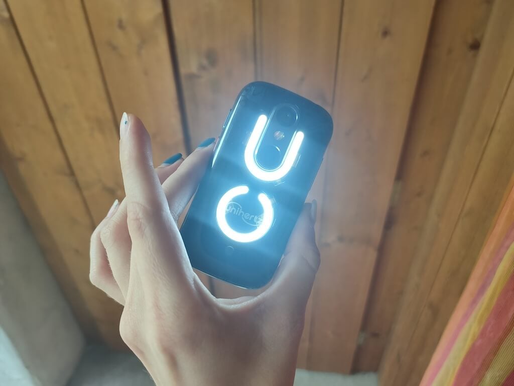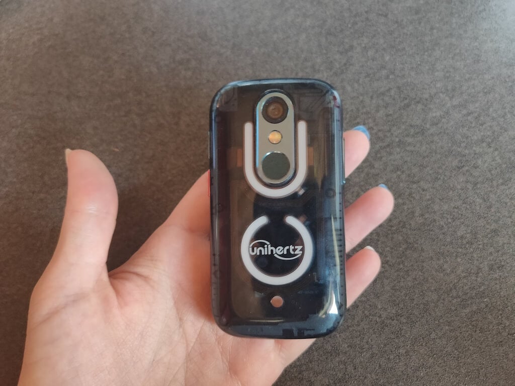 Όταν αναστρέψετε το τηλέφωνο, θα δείτε μια ημιδιαφανή πίσω με ένα προεξέχον λογότυπο Unihertz. Υπάρχει ένας φακός κάμερας, ένα φλας και ένας αισθητήρας δακτυλικών αποτυπωμάτων με κομψό μεταλλικό φινίρισμα. Ο αισθητήρας δακτυλικών αποτυπωμάτων και το λογότυπο Unihertz πλαισιώνονται από δύο μικρές αλλά φωτεινές λωρίδες LED.