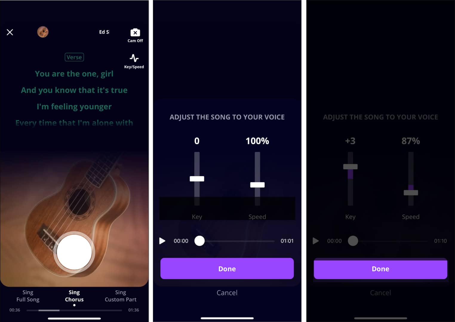 ΟΚλειδί/ταχύτηταΤο χαρακτηριστικό σας επιτρέπει να προσαρμόσετε το τραγούδι στη φωνή σας, φέρνοντας το κλειδί επάνω (μέχρι +6) ή κάτω (έως -6) για να ταιριάζει με το κλειδί σας και να αλλάξετε την ταχύτητα του τραγουδιού (από 70% σε 150% την αρχική ταχύτητά σας) με βάση τον προτιμώμενο ρυθμό σας. Σημειώστε ότι η δωρεάν έκδοση σας επιτρέπει να ρυθμίσετε το κλειδί από -2 έως +2 και την ταχύτητα από 91-109%.