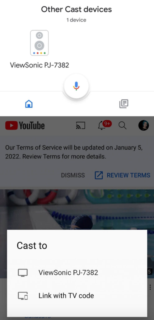 Το Viewsonic M2E υποστηρίζει την Mirroring Screen, η οποία εν μέρει αντισταθμίζει τα θέματα που μπορεί να έχετε με την επιλογή εφαρμογών. Όταν ανοίγετε μια εφαρμογή όπως το YouTube στον υπολογιστή ή το smartphone σας, ο προβολέας θα εμφανιστεί στο μενού cast όταν επιλέγετε το εικονίδιο cast.