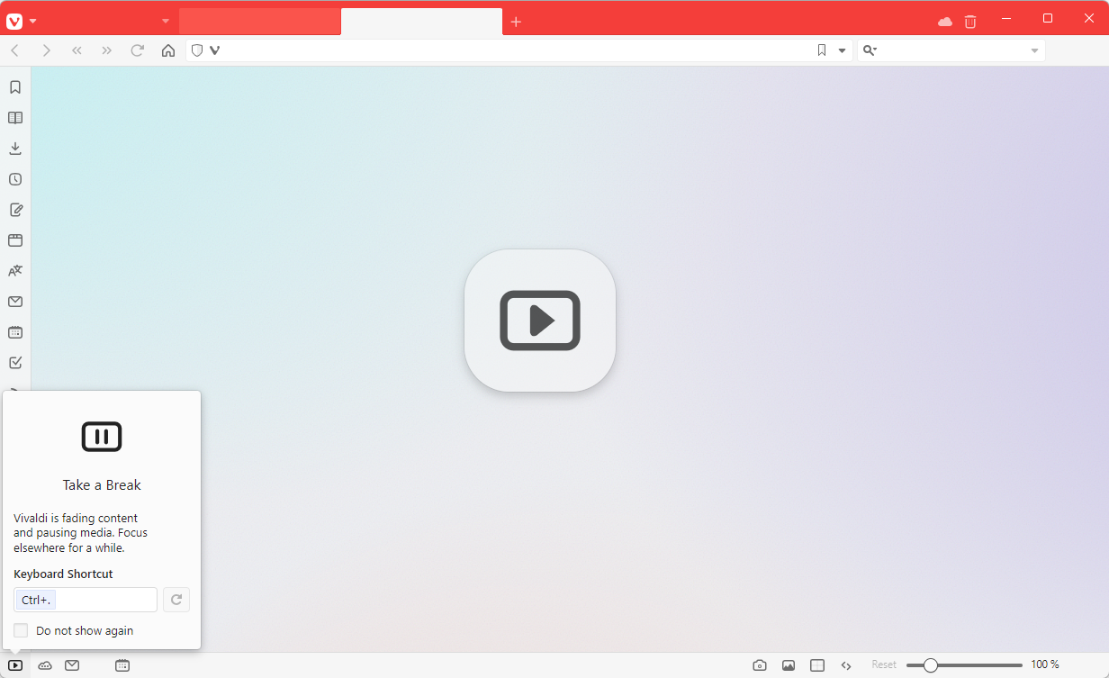 Το Vivaldi παύει την αναπαραγωγή των μέσων ενημέρωσης και εξασθενεί όλο το περιεχόμενο του ιστότοπου ενώ βρίσκεται σε λειτουργία διάλειμμα. Μπορείτε να το βγείτε ανά πάσα στιγμή με ένα κλικ στο κουμπί στη μέση του παραθύρου Vivaldi.