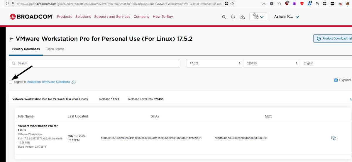 Πρέπει να κάνετε κλικ στο "VMware Work Station Pro 17 για προσωπική χρήση". Επιλέξτε την κατάλληλη έκδοση για το λειτουργικό σας σύστημα, δηλαδή Windows ή Linux. Κάντε κλικ σε αυτό και στη συνέχεια στον τελευταίο αριθμό έκδοσης. Η ιστοσελίδα θα εμφανίσει ένα πλαίσιο ελέγχου που πρέπει να σημειώσετε, να αποδεχτείτε τους όρους και τις προϋποθέσεις. Αυτό θα σας επιτρέψει να κατεβάσετε το VMware Work Station Pro 17. Για να το κάνετε, κάντε κλικ στο κουμπί Cloud και το αρχείο σας θα πρέπει να κατεβάσετε στιγμιαία.