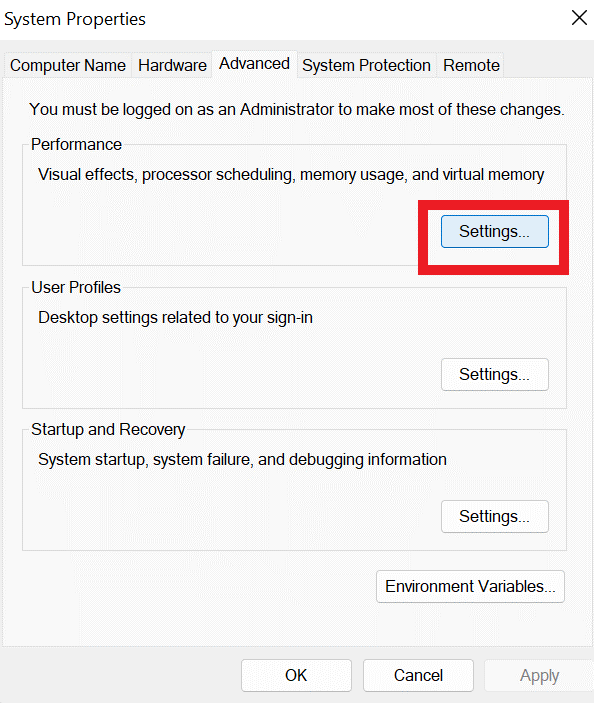 - Όταν τοΙδιότητες συστήματοςΑνοίγει το παράθυρο, κάντε κλικ στοΡυθμίσειςυπόΕκτέλεση.