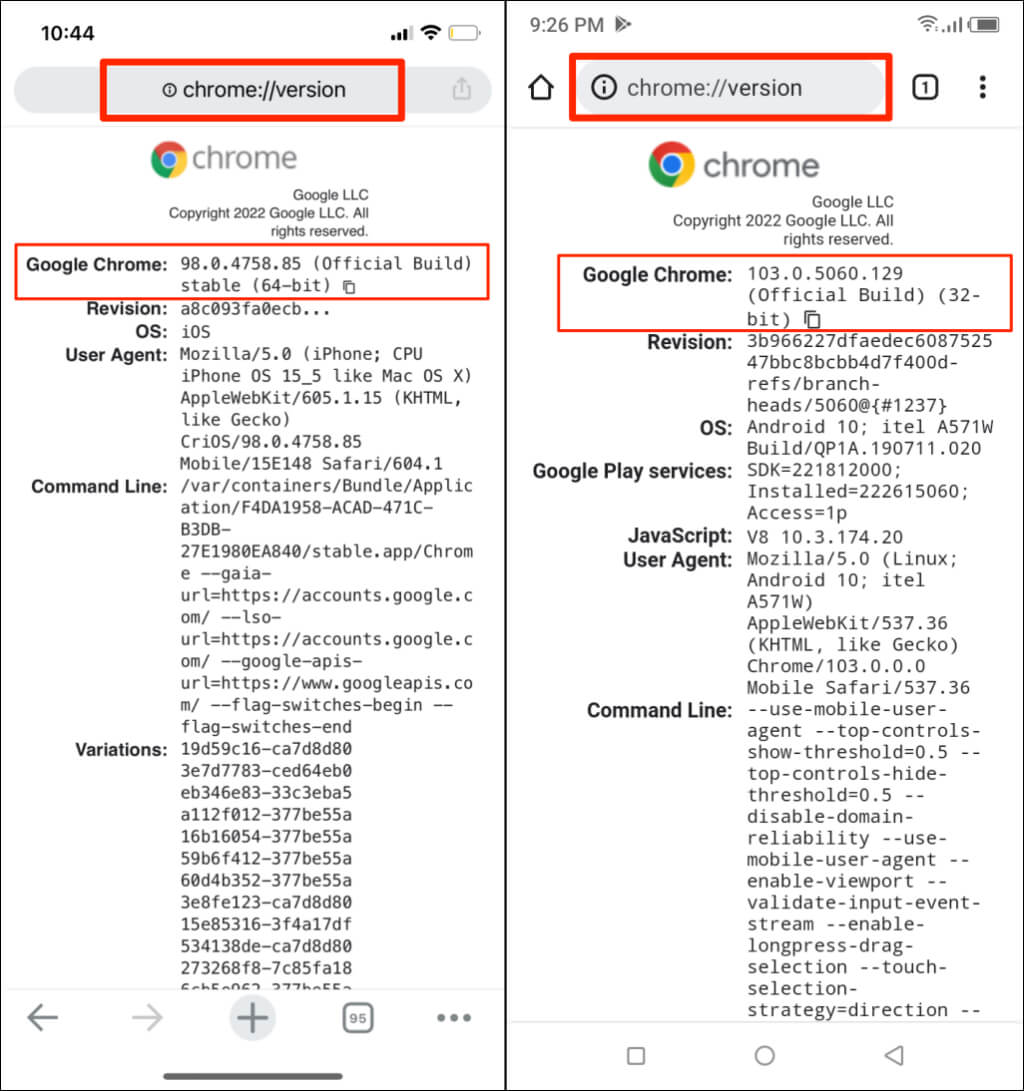 Αυτή η τεχνική λειτουργεί επίσης στις κατασκευές κινητής τηλεφωνίας του προγράμματος περιήγησης Google Chrome. Ανοίξτε το Chrome στη συσκευή σας Android ή iOS και εισάγετεChrome: // έκδοσηΣτη γραμμή διευθύνσεων. Ελέγξτε τη σειρά Google Chrome για την έκδοση του προγράμματος περιήγησης ή τον αριθμό δημιουργίας.