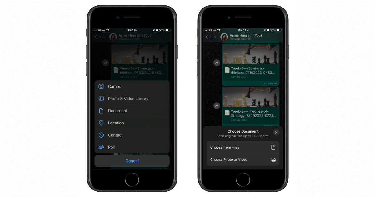 Η ανάπτυξη αυτού του χαρακτηριστικού εφαρμόζεται σταδιακά, με όλους τους χρήστες του iOS να το λαμβάνουν τις επόμενες εβδομάδες. Για να αποκτήσετε πρόσβαση, οι χρήστες μπορούν να πατήσουν το "+"Εικονίδιο σε συνομιλία> ΕπιλέξτεΕγγραφο,> πατήστεΕπιλέξτε φωτογραφία ή βίντεο. Αυτή η απλή διαδικασία εξαλείφει την ανάγκη για χειροκίνητες λύσεις που χρησιμοποιούνται προηγουμένως για την αποστολή μέσων υψηλής ποιότητας.