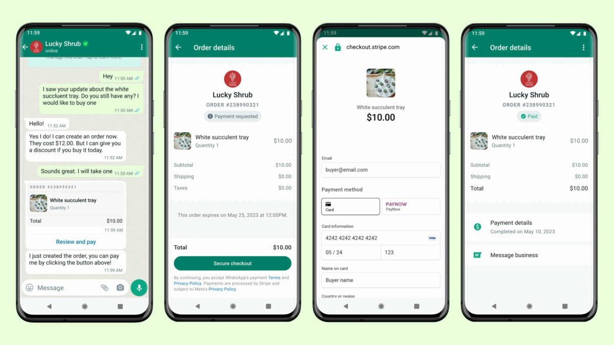 Σε συνεργασία με την Stripe, ένας κορυφαίος επεξεργαστής παγκόσμιων πληρωμών, το WhatsApp Pay προσφέρει μια βολική και αποτελεσματική διαδικασία checkout εξ ολοκλήρου στο πλαίσιο της διεπαφής συνομιλίας WhatsApp. Μετά την ολοκλήρωση, τόσο ο πελάτης όσο και ο έμπορος λαμβάνουν επιβεβαίωση άμεσης πληρωμής.