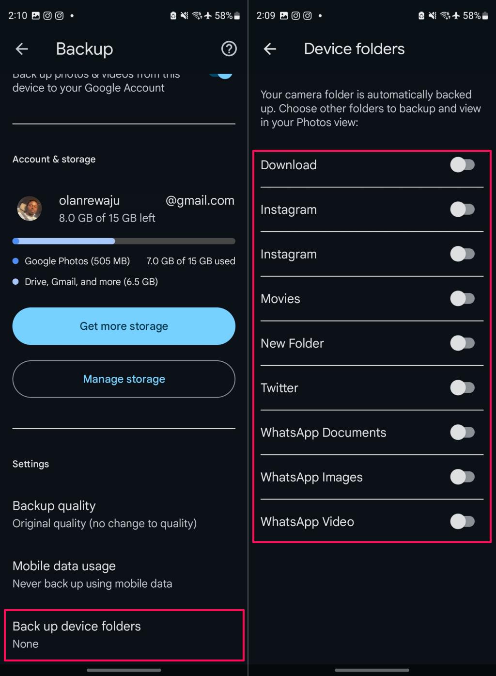 - ΕπιλέγωΦάκελοι δημιουργίας αντιγράφων ασφαλείαςΚαι εναλλαγή στους φακέλους που θέλετε να δημιουργήσετε αντίγραφα ασφαλείας στο Google. Το Google Photos θα ξεκινήσει τη μεταφόρτωση φωτογραφιών από τους φακέλους στον λογαριασμό σας.