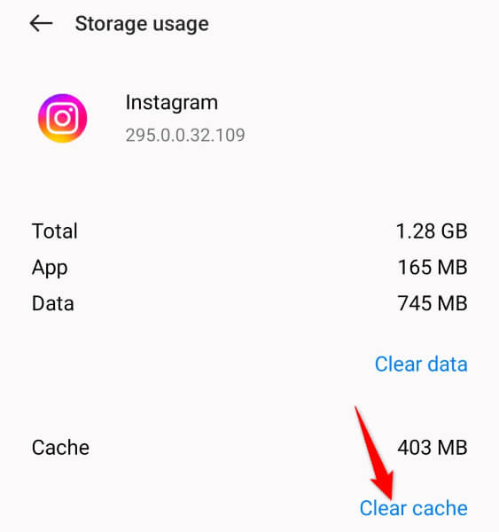 Ένας άλλος διορθωμένος χρήστες Android μπορούν να χρησιμοποιήσουν είναι να καθαρίσουν την προσωρινή μνήμη εφαρμογών, η οποία βοηθά στην επίλυση πολλών προβλημάτων. Μπορείτε να το κάνετε αυτό με την κατεύθυνσηΡυθμίσεις>Εφαρμογές>Διαχείριση εφαρμογών>Instagram>Χρήση αποθήκευσηςκαι πατώνταςΚαθαρή κρυφή μνήμη. Δεν χάνετε τα δεδομένα του λογαριασμού σας όταν το κάνετε αυτό.