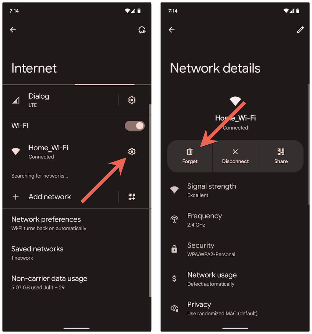 Πάρα πολλά αποθηκευμένα ασύρματα δίκτυα στο τηλέφωνό σας Android είναι ένας άλλος λόγος για ξαφνικές αποσυνδέσεις Wi-Fi. Επανεξετάστε την οθόνη συνδέσεων στο Διαδίκτυο και αφαιρέστε τυχόν συνδεδεμένα δίκτυα που δεν χρειάζεστε πλέον.